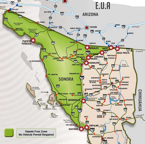 Even though the entering program Only Sonora has existed since 1996, the State Government launched this attractive Free Zone on December 14th 2006 that only requires obtaining a permit if traveling further than kilometer 98 of the Federal Highway No. 15. If the visitor wishes to go further tan this point, a permit can be obtained at any Banjercito branch office, located along the border of the United States and Mexico, which is valid for 180 days after complying with all the necessary requirements. The vehicle permits are available at the check point at Kilometer 21, just south of Nogales on Highway 15. Call 1-800-4-SONORA if you are entering from another border crossing. Permits must be returned at this same location with the 180 day period.